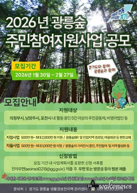 어웨이크뉴스 오경하 기자 | 경기도가 광릉숲 생물권보전지역 활성화를 위해 2026년 광릉숲 주민참여지원사업 참여자를 모집한다.