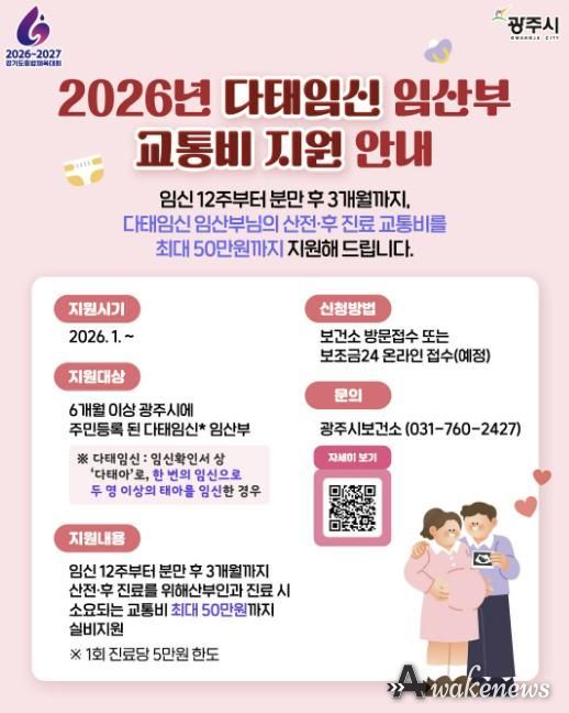 어웨이크뉴스 오경하 기자 | 광주시는 2026년 1월부터 다태임신 임산부를 대상으로 교통비 지원사업을 새롭게 시행하며 고위험 임산부에 대한 맞춤형 지원을 강화한다고 2일 밝혔다.