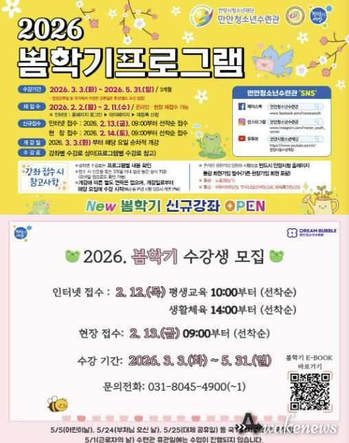 만안청소년수련관은 3월 3일부터 5월 31일까지 봄학기 강좌를 운영하며, 총 141개 강좌, 245개 반을 개설한다. 수강 신청은 2월 13일부터 온라인 접수, 2월 14일부터 현장 방문 접수가 가능하며, 모든 강좌는 선착순으로 모집한다.