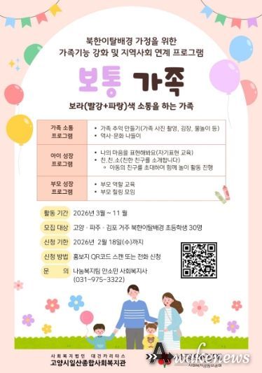 어웨이크뉴스 오경하 기자 | 고양시일산종합사회복지관이 북한이탈배경 가정의 가족기능 강화 및 지역사회 통합 프로그램 ‘보통 가족’의 참여자를 이달 18일까지 모집한다.