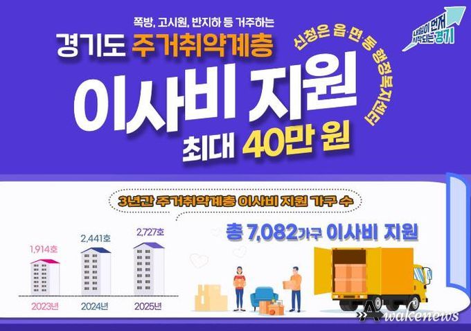 어웨이크뉴스 오경하 기자 | 경기도가 쪽방, 고시원, 반지하 등 열악한 주거환경에 거주하고 있는 주거취약계층의 안정적 이주를 위해 올해도 ‘주거취약계층 이사비 지원사업’을 이어간다.