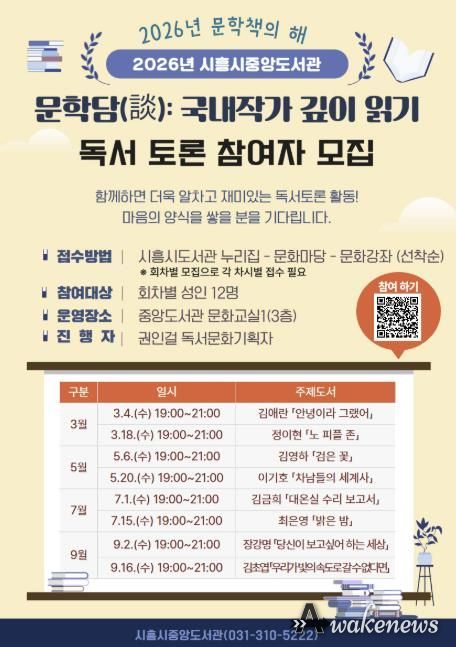 어웨이크뉴스 오경하 기자 | 시흥시중앙도서관은 ‘2026년 문학책의 해’를 맞아 국내 대표 문학 작가 소설을 주제로 한 독서토론 ‘문학담(談): 국내 작가 깊이 읽기’를 오는 3월부터 9월까지 운영한다.
