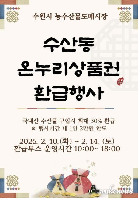 어웨이크뉴스 오경하 기자 | 수원시농수산물도매시장 수산동이 설을 맞아 2월 10일부터 14일까지 온누리상품권 환급 행사를 연다.