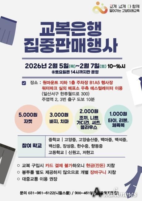 어웨이크뉴스 오경하 기자 | 경기도고양교육지원청은 관내 중·고등학교 졸업생의 교복 물려주기 일환으로 교복은행 집중판매 행사를 2월 5일부터 7일까지 3일간 고양 원마운트에서 진행한다고 밝혔다.