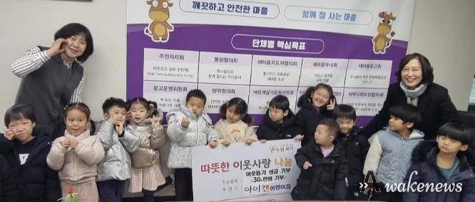 어웨이크뉴스 오경하 기자 | 수원시 팔달구 우만1동은 지난 2월 3일, 아이캔어린이집 원아 40명과 교사들이 함께 우만1동 행정복지센터를 방문해 취약계층를 돕기 위한 이웃돕기 성금 30여만 원을 기부했다.