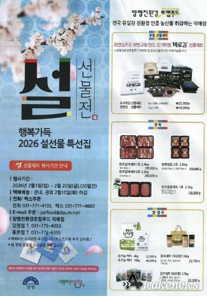 한편, 양평 농특산물 설 선물전 택배 주문은 관내·관외 모두 2월 10일까지 가능하다. 주문은 양평친환경로컬푸드협동조합 사무국으로 문의하거나, 양평친환경로컬푸드 누리집에서 주문서를 내려받아 팩스 또는 전자우편으로 신청하면 된다.