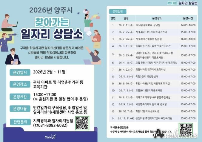 어웨이크뉴스 오경하 기자 | 양주시가 구직 현장의 문턱을 낮추고 시민들의 취업 성공률을 높이기 위해 오는 11월까지 ‘2026년 찾아가는 일자리 상담소' 를 운영한다.