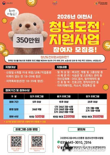 어웨이크뉴스 오경하 기자 | 이천시는 지역 내 미취업 청년들의 진로 탐색과 취업역량 강화를 위해 운영하는 ‘청년도전지원사업’의 참여자를 2월 4일부터 모집한다고 밝혔다.