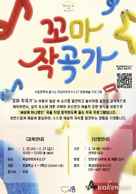 관내 거주하는 초등학생 3학년~5학년이라면 누구나 무료로 참여할 수 있다. 참여 신청은 2월 10일 10시부터 목감아트하우스27 또는 시흥문화예술 소통누리망(블로그ㆍ인스타그램)을 통해 가능하며 선착순으로 마감된다.