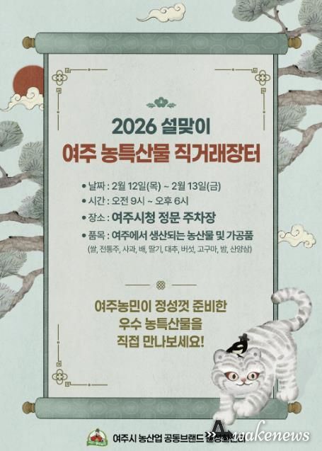 어웨이크뉴스 오경하 기자 | 여주시는 설 명절을 맞아 지역 농업인의 판로를 확대하고 시민들의 장바구니 부담을 줄이기 위해 오는 2월 12일부터 13일까지 이틀간 ‘2026 설맞이 여주 농특산물 직거래장터’를 개최한다.