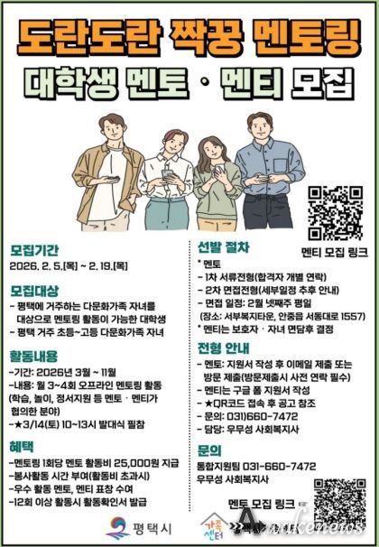 어웨이크뉴스 오경하 기자 | 평택시가족센터는 2월 5일부터 19일까지 다문화가족 자녀 대상 ‘도란도란 짝꿍 멘토링’에 참여할 대학생 멘토와 멘티를 모집한다.