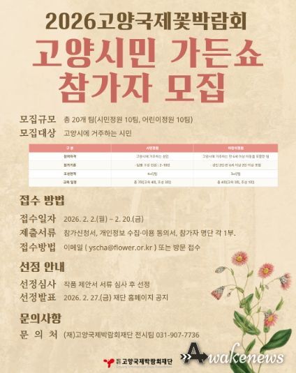 어웨이크뉴스 오경하 기자 | (재)고양국제박람회재단이 오는 4월 24일 일산호수공원에서 개최되는 2026고양국제꽃박람회의 시민 참여 프로그램 ‘고양시민 가든쇼’의 참가자를 이달 20일까지 모집한다.
