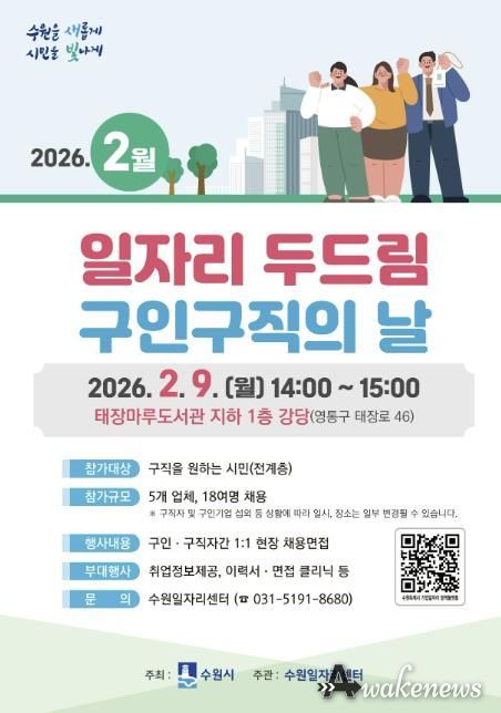 어웨이크뉴스 오경하 기자 | 수원특례시는 2월 9일 오후 2시부터 3시까지 태장마루도서관 강당에서 ‘2월 일자리 두드림 구인·구직의 날’을 개최한다.