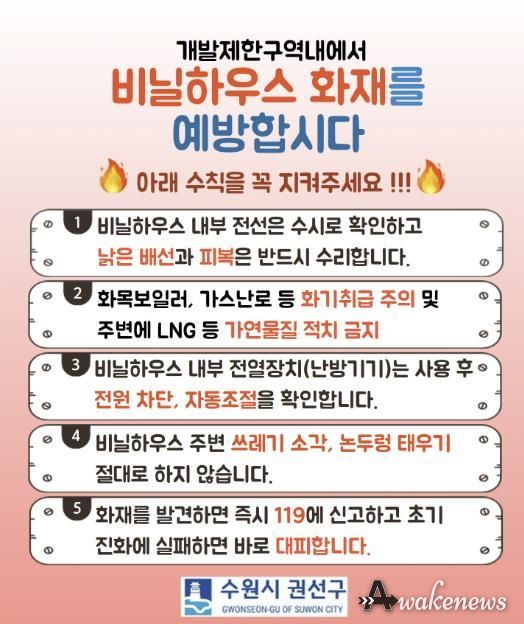 권선구 관계자는 “비닐하우스 화재는 작은 부주의로도 큰 피해로 이어질 수 있는 만큼, 기본적인 안전수칙 실천이 무엇보다 중요하다”며 “앞으로도 개발제한구역 내 화재 취약 시설을 대상으로 지속적인 점검과 홍보 활동을 이어가겠다”라고 밝혔다.