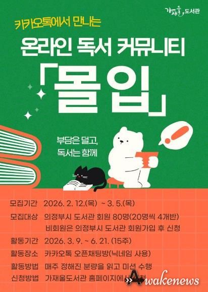 어웨이크뉴스 오경하 기자 | 의정부가재울도서관은 3월 9일부터 6월 21일까지 총 15주 동안 운영하는 온라인 독서챌린지 ‘몰입’의 8기 참여자를 모집한다.