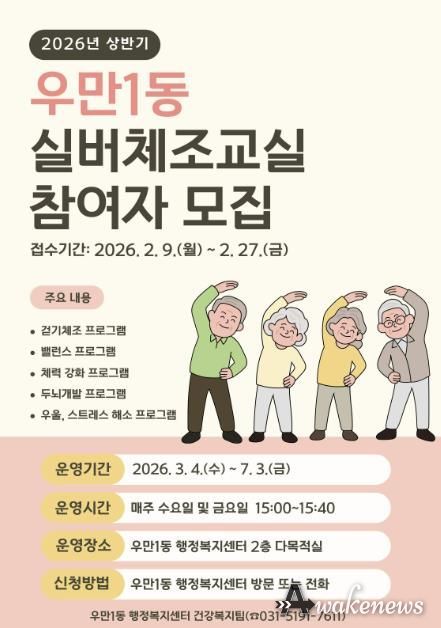 어웨이크뉴스 오경하 기자 | 수원시 팔달구 우만1동은 관내 어르신들의 건강 증진을 위해 2월 9일부터 2월 27일까지 ‘2026년 상반기 실버체조교실’ 참여자를 선착순으로 모집한다고 밝혔다.