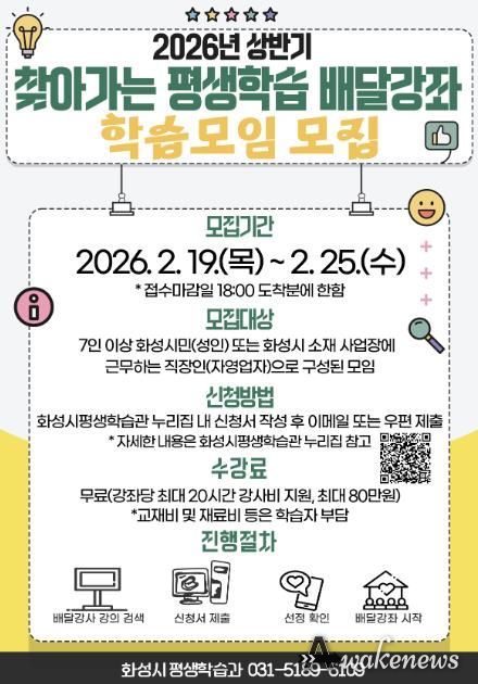 어웨이크뉴스 오경하 기자 | 화성특례시는 2월 19일부터 2월 25일까지 2026년 상반기'찾아가는 평생학습 배달강좌'학습모임을 모집한다.
