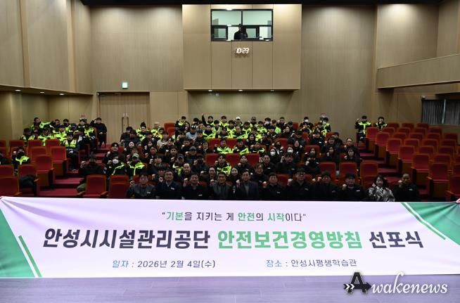 어웨이크뉴스 오경하 기자 | 안성시시설관리공단은 지난 2월 4일, 종사자와 시민의 생명 보호 및 안전한 시설 운영을 위한 ‘2026년 안전보건경영방침 선포식’을 개최했다고 밝혔다.