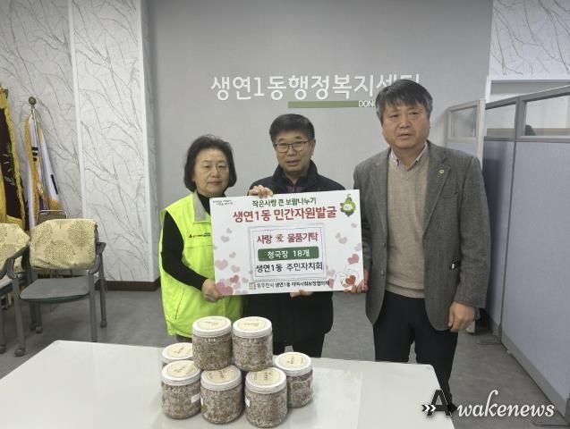 어웨이크뉴스 오경하 기자 | 동두천시 생연1동 행정복지센터는 지난 5일, 생연1동 주민자치회가 직접 만든 ‘사랑 愛 청국장’을 관내 경로당 어르신들에게 전달했다고 밝혔다.