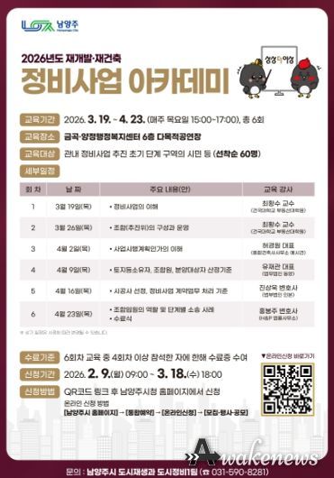 어웨이크뉴스 오경하 기자 | 남양주시는 오는 3월 19일부터 정비사업에 관심 있는 시민을 대상으로 ‘2026 상상더이상 정비사업 아카데미’를 열고, 이에 앞서 2월 9일부터 참가 신청 접수를 진행한다고 6일 밝혔다.