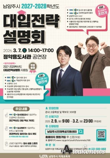 어웨이크뉴스 오경하 기자 | 남양주시는 오는 3월 7일 정약용도서관 공연장에서 관내 고등학생과 학부모를 대상으로 ‘남양주시 2027~2028학년도 대입전략설명회’를 열고, 이에 앞서 2월 9일부터 참가 신청 접수를 진행한다.