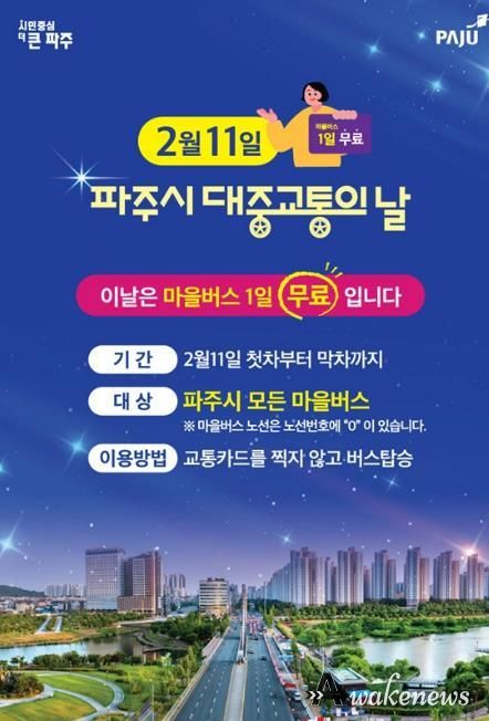 어웨이크뉴스 오경하 기자 | 파주시는 ‘대중교통의 날’을 맞아 대중교통 이용 활성화와 시민 교통비 부담 완화를 위해 오는 2월 11일 하루 동안 파주시 전 지역의 모든 마을버스를 무료로 운행한다.
