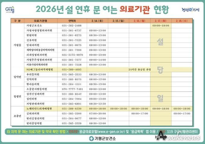 어웨이크뉴스 오경하 기자 | 가평군이 설 연휴 기간 의료 공백 최소화에 나선다. 군은 2월 14일부터 18일까지 이어지는 설 연휴 동안 군민 의료 불편을 최소화하기 위해 응급진료상황실을 설치·운영한다고 밝혔다.