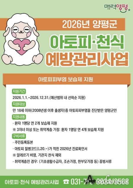 어웨이크뉴스 오경하 기자 | 양평군은 지역사회 중심의 알레르기질환 조기 발견과 적절한 치료를 위해 양평군민을 대상으로 2026년 연중 ‘아토피피부염 보습제 지원’과 ‘취약계층 알레르기질환 의료비 지원’ 사업을 추진한다고 밝혔다.