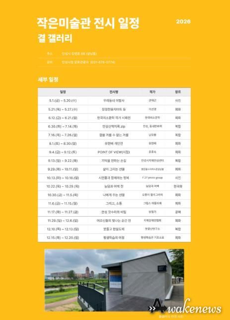 어웨이크뉴스 오경하 기자 | 안성시는 2월 9일 ‘안성시 작은미술관(결갤러리, 시옷갤러리) 전시 공모’ 심사 결과를 발표하고, 총 31개의 전시를 최종 선정했다고 밝혔다.