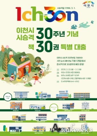 어웨이크뉴스 오경하 기자 | 이천시는 시 승격 30주년(시승격일 1996.3.1.)을 기념해 시민의 독서 참여를 확대하고 책 읽는 도시 이천의 정체성을 강화하고자, 오는 2월 23일부터 3월 2일까지 ‘책 30권 특별대출’ 서비스를 운영한다.