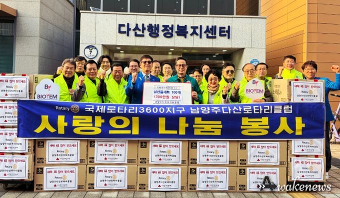 어웨이크뉴스 오경하 기자 | 남양주시는 11일 국제로타리3600지구 남양주다산로타리클럽과 울림로타리위성클럽이 다가오는 설을 맞아 300만 원 상당의 설 선물세트를 다산1동 지역사회보장협의체에 기탁했다고 밝혔다.