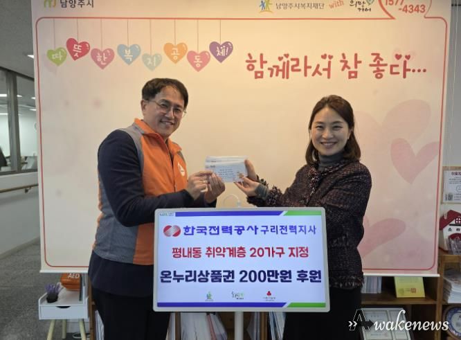 어웨이크뉴스 오경하 기자 | 남양주시는 지난 9일 한국전력공사 구리전력지사가 설 명절을 맞아 평내동 취약계층 지원을 위해 온누리상품권 200만 원을 동부희망케어에 전달했다고 밝혔다.