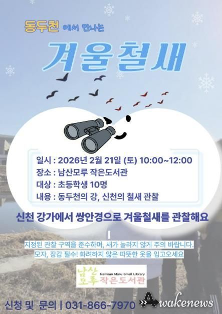 어웨이크뉴스 오경하 기자 | 동두천시 남산모루 작은도서관은 오는 2월 21일 오전 10시부터 정오까지 도서관 인근 신천에서 겨울 철새 관찰 프로그램을 운영한다.