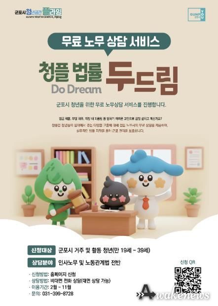 어웨이크뉴스 오경하 기자 | 군포시 청년공간 플라잉은 관내 청년들의 노동권 보호와 일상생활 속 법률 고충 해결을 위해 무료 전문 상담 서비스인 ‘청플 법률 두드림(Do Dream)’을 본격 운영한다고 밝혔다.