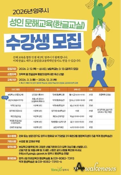양주시 관계자는 “배움에는 늦은 때가 없는 만큼, 기초 문해교육이 필요한 시민이라면 주저하지 말고 성인 문해교실의 문을 두드려 주시길 바란다”고 말했다.