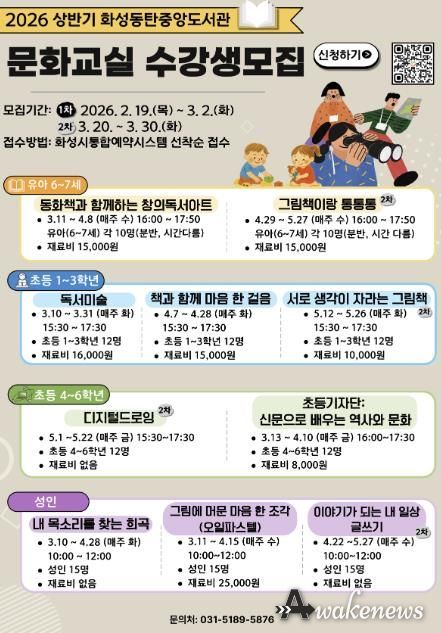 어웨이크뉴스 오경하 기자 | 화성특례시는 지난해 11월 3일 개관한 화성동탄중앙도서관에서 시민들이 다양한 독서·문화 활동을 즐길 수 있도록 2026년 상반기 문화교실 프로그램을 운영한다고 밝혔다.