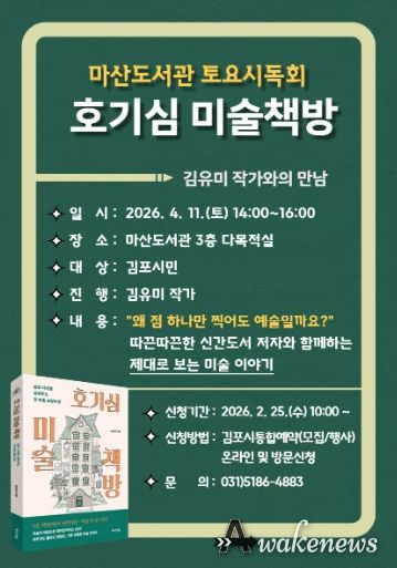 어웨이크뉴스 오경하 기자 | 김포시 마산도서관은 오는 4월 11일 오후 2시부터 4시까지 ‘토요시독회’ '호기심 미술책방'을 운영한다. ‘토요시독회’는 최근 출간된 신간도서를 중심으로 저자와 시민이 만나 책의 내용을 깊이 있게 나누는 독서문화 프로그램이다.