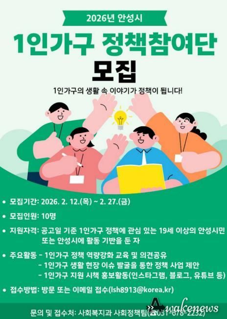 어웨이크뉴스 오경하 기자 | 안성시는 1인가구 시민의 생활 속 이야기와 의견을 정책에 담기 위해 '2026년 안성시 1인가구 정책참여단'을 오는 2월 27일까지 공개 모집한다고 밝혔다.