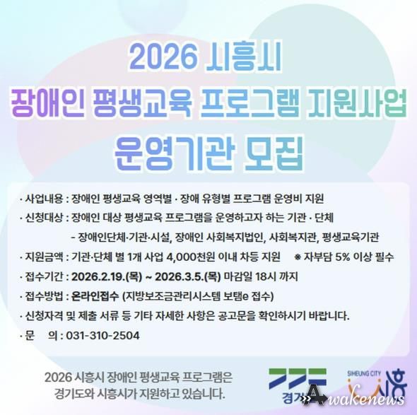 어웨이크뉴스 오경하 기자 | 시흥시는 장애인의 학습권을 보장하고 사회참여 기회를 확대하기 위해 ‘2026년 장애인 평생교육 프로그램 지원사업’을 추진하는 가운데 운영기관을 모집한다.
