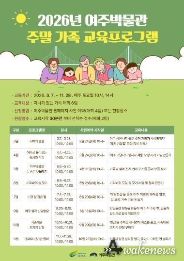 어웨이크뉴스 오경하 기자 | 여주시 여주박물관은 오는 3월 7일부터 11월 28일까지 매주 토요일, 가족 단위 관람객을 대상으로 한 ‘2026년 주말 가족 대상 교육프로그램’을 운영한다.