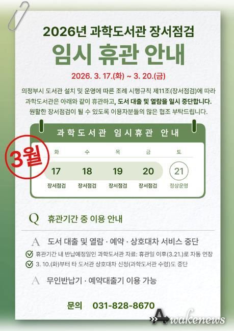 어웨이크뉴스 오경하 기자 | 의정부과학도서관은 소장 자료의 상태와 보유 현황을 체계적으로 점검하기 위해 3월 17일부터 20일까지 4일간 임시 휴관한다.