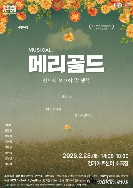 어웨이크뉴스 오경하 기자 | 경기도와 경기아트센터는 오는 28일 오후 2시와 6시 경기아트센터 소극장에서 뮤지컬 ‘메리골드’ 공연을 선보인다.