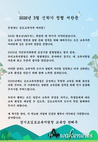 어웨이크뉴스 오경하 기자 | 김포교육지원청은 2026년 3월 신학기를 맞아 관내 학교를 대상으로 ‘교육장 청렴 서한문’을 발송했다고 밝혔다.