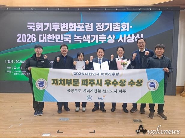 어웨이크뉴스 오경하 기자 | 파주시는 2월 25일 여의도 국회 국회의원회관에서 열린 ‘2026 대한민국 녹색기후상’ 시상식에서 자치부문 우수상을 수상했다.