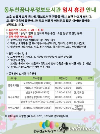 어웨이크뉴스 오경하 기자 | 동두천시 도서문화사업소 꿈나무정보도서관은 노후 승강기 교체 공사 시행에 따라 오는 3월 20일부터 4월 19일까지 임시 휴관한다고 밝혔다.