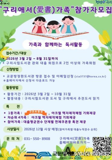 어웨이크뉴스 오경하 기자 | 구리시 교문방정환도서관은 독서 프로그램 '구리애서(愛書)가족'의 참여 가족을 3월 2일부터 모집한다고 밝혔다.