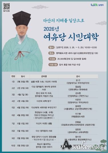 어웨이크뉴스 오경하 기자 | 남양주시는 오는 26일부터 5월 29일까지 정약용도서관에서 다산 정약용 선생의 삶과 사상을 시민의 눈높이에서 살펴보는‘2026 여유당 시민대학’에 참여할 수강생을 모집한다고 3일 밝혔다.