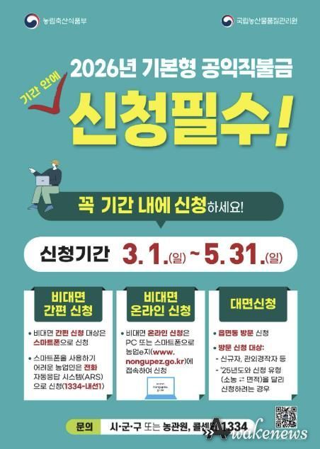 어웨이크뉴스 오경하 기자 | 시흥시는 5월 31일까지 ‘2026년 기본형 공익직불금’ 신청을 받는다고 5일 밝혔다.