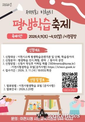 부스 및 공연 참가 신청은 3월 11일까지 접수하며, 신청서 양식은 이천시 평생학습 포털 내 소식정보(공지사항)에서 내려받을 수 있다. 심사 결과는 평생학습실무추진위원회 심사를 거쳐 3월 중 발표될 예정이다.