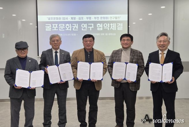 어웨이크뉴스 오경하 기자 | 부천문화원과 강서문화원, 계양문화원, 김포문화원, 부평문화원은 3월 4일 부천문화원에서 ‘굴포문화권’을 토대로 하는 연구교류 협약식을 체결했다. 이로써 ‘굴포’를 같은 문화권으로 하는 부천문화원·강서문화원·계양문화원·김포문화원·부평문화원은 학술대회와 콘텐츠 발굴 사업 등 다양한 지역학 자원을 발굴하고 활성화하기 위해 최초로 지역학 연구 모델을 구축하게 됐다. 특히, 이번 협약은 경기도(부천, 김포), 서울특별시(강서), 인천광역시(계양, 부평)를 잇는 ‘지역학’ 중심의 연구 교류를 마련한다는 점에서 주목된다.